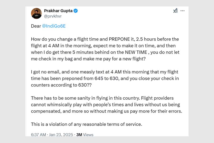 "I got no email, and one measly text at 4 AM this morning that my flight time has been preponed from 6:45 to 6:30, and you close your check-in counters according to 6:30?"