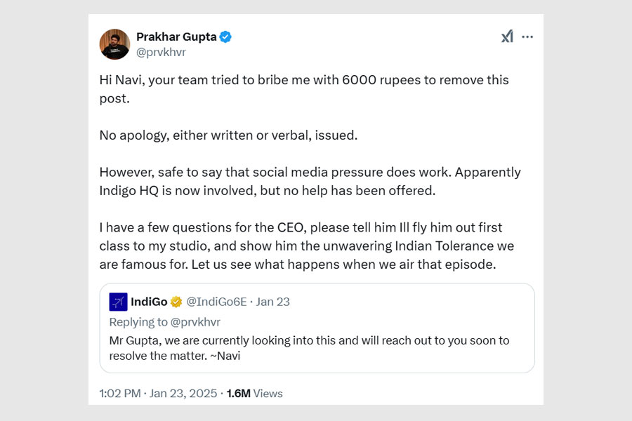 Prakhar hit back, alleging that the airline offered him Rs. 6,000 as compensation in exchange for deleting his post. "No apology, either written or verbal, was issued. However, safe to say that social media pressure does work. Apparently, IndiGo HQ is now involved, but no help has been offered," he claimed.