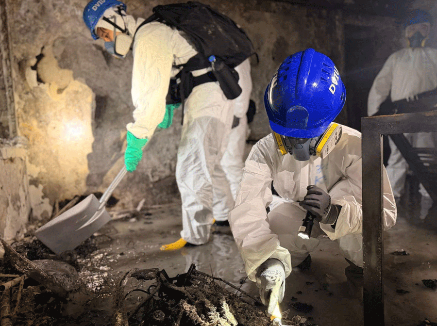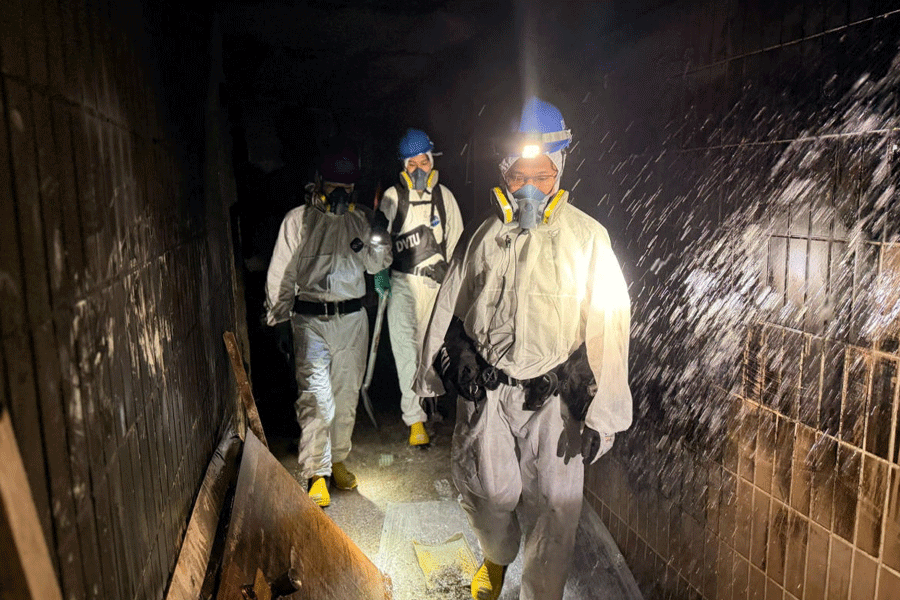 Images shared by police showed officers clad in hazmat suits, face masks and helmets, inspecting rooms with blackened walls and furniture reduced to ashes, and wading through water used to douse fires that raged for days.