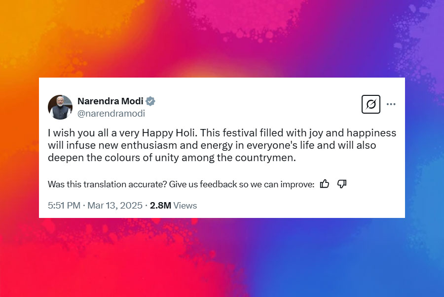 Prime Minister Narendra Modi extended his Holi wishes on X, writing, "I wish you all a very Happy Holi. This festival filled with joy and happiness will infuse new enthusiasm and energy in everyone's life and will also deepen the colours of unity among the countrymen."