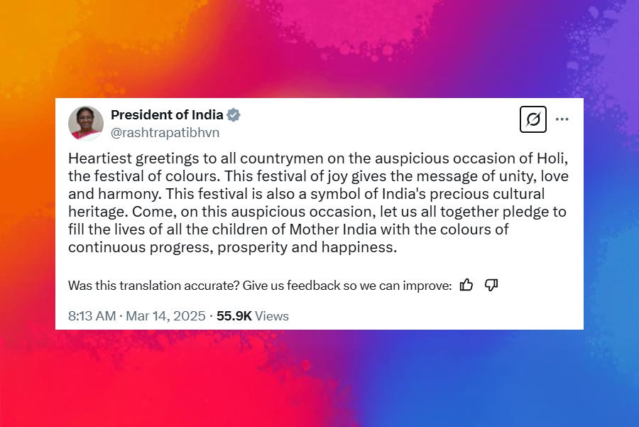 President Droupadi Murmu also shared greetings: "Heartiest greetings to all countrymen on the auspicious occasion of Holi, the festival of colours. This festival of joy gives the message of unity, love, and harmony. This festival is also a symbol of India's precious cultural heritage."
