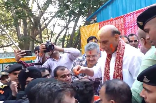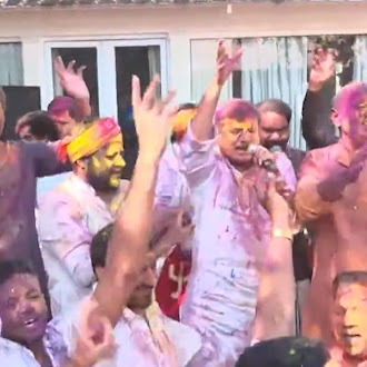 Defence Minister Rajnath Singh celebrated outside his residence, stating, "Greetings to the countrymen on the holy occasion of #Holi...Greetings to everyone who is celebrating and observing, be it Holi or Ramzan."