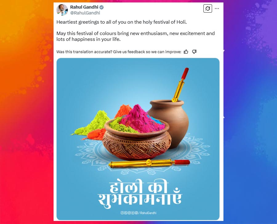 Congress MP Rahul Gandhi posted on X, "Heartiest greetings to all of you on the holy festival of Holi. May this festival of colours bring new enthusiasm, new excitement and lots of happiness in your life."