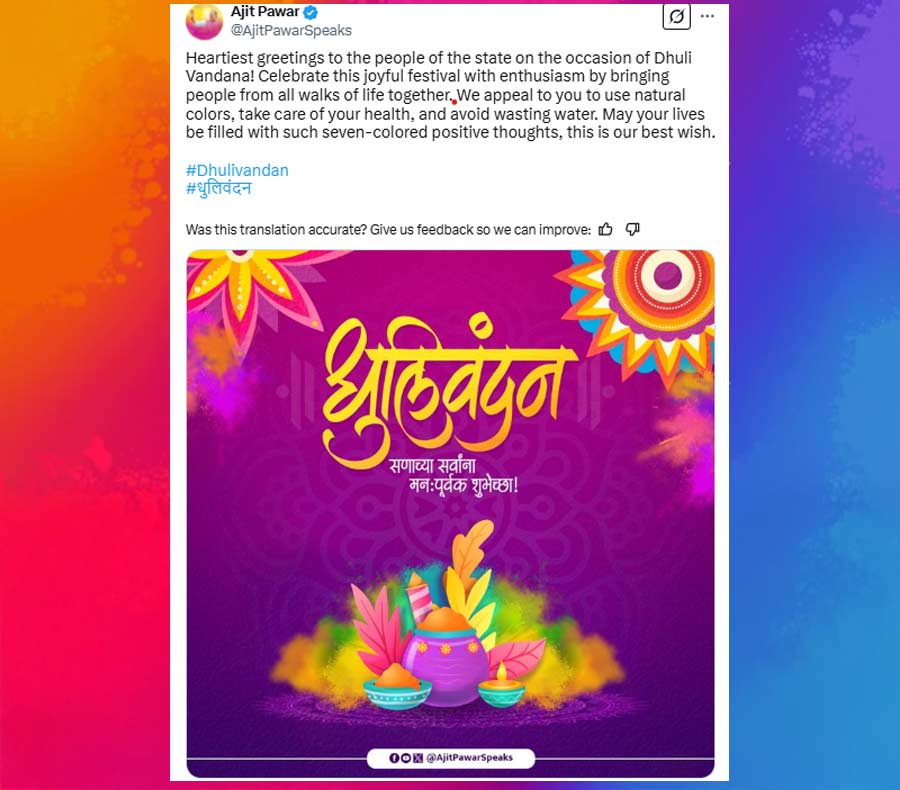 Maharashtra leaders, including Ajit Pawar and Devendra Fadnavis, focused on environmental consciousness and progress. Pawar urged people to "use natural colors, take care of health, and avoid wasting water," while Fadnavis linked Holi to "the colors of innovation and progress, shaping Maharashtra’s bright future."