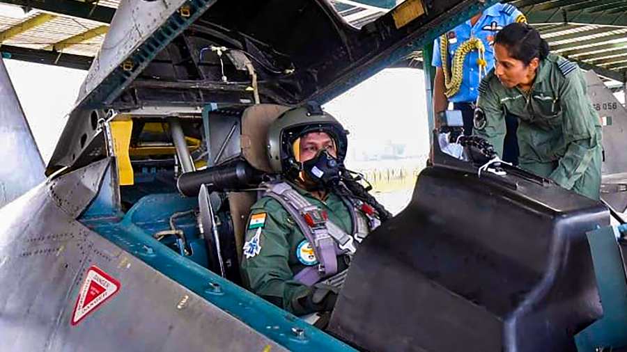 After sitting in the cockpit, a woman officer helped her put on the helmet and complete other technicalities. She waved from the cockpit just seconds before the aircraft canopy was shut.
