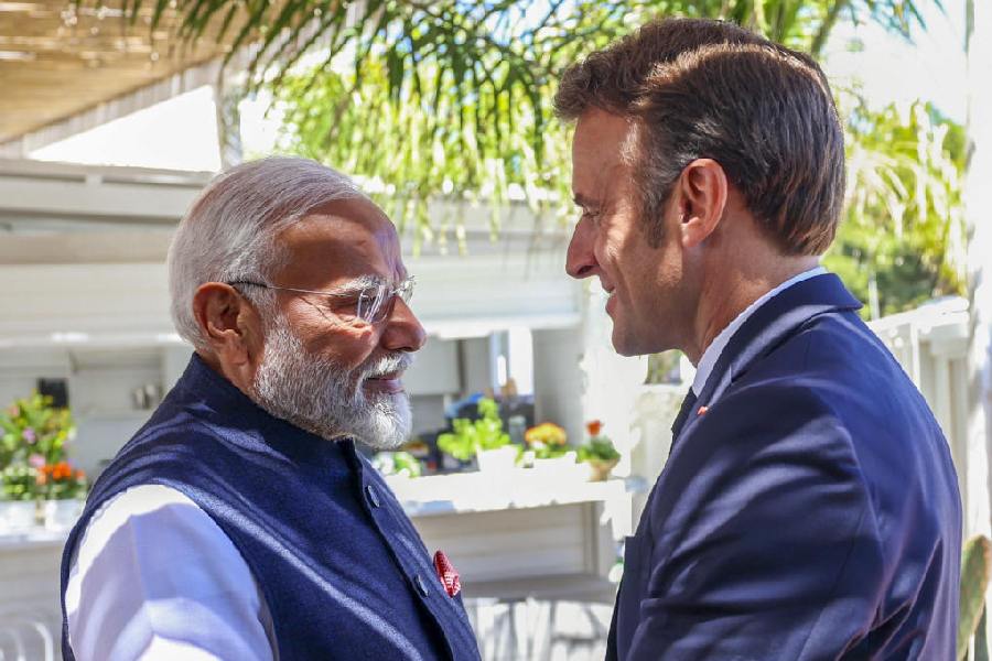Prime Minister Narendra Modi and French President Emmanuel Macron during a bilateral meeting on the sidelines of the G7 Summit in Apulia, Italy, June 14, 2024. The two leaders discussed ways to further strengthen the strategic partnership including in areas of defence, nuclear and space, and exchanged views on key global and regional issues. It is Prime Minister Modi's first foreign trip after assuming office for a third time this month.