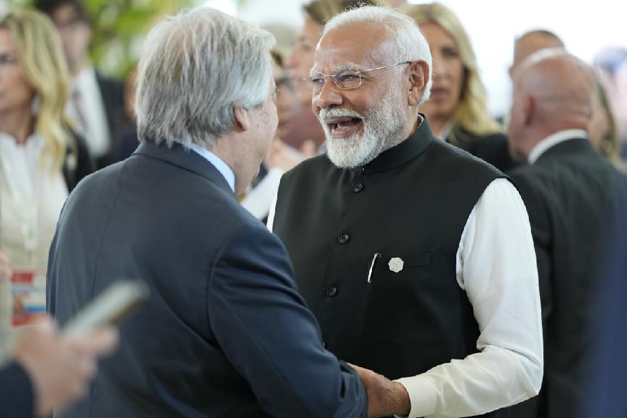 Prime Minister Narendra Modi talks with U.N. Secretary-General António Guterres, left, during a working session on AI, Energy, Africa and Mideast, at the G7, Friday, June 14, 2024, in Borgo Egnazia, near Bari, southern Italy.