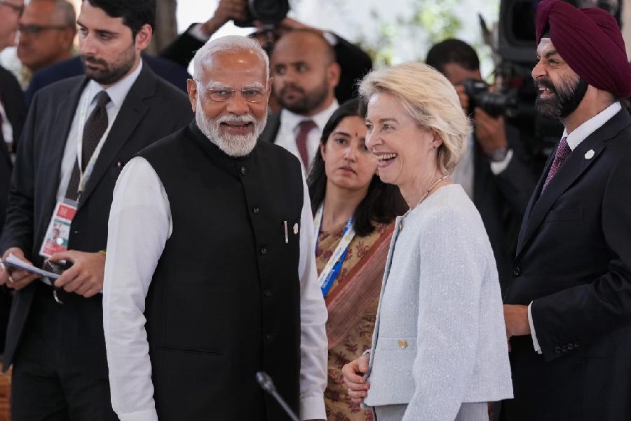European Commission President Ursula von der Leyen, right, talks to Indian Prime Minister Narendra Modi during a working session on AI, Energy, Africa and Mideast at the G7 summit, in Borgo Egnazia, near Bari in southern Italy, Friday, June 14, 2024.