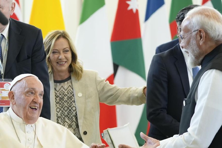 Indian Prime Minister Narendra Modi, right, greets Pope Francis during a working session on AI, Energy, Africa and Mideast, at the G7, Friday, June 14, 2024, in Borgo Egnazia, near Bari, southern Italy. Modi was seen in a light-hearted exchange with the 87-year-old head of the worldwide Catholic Church, who was taken around the table in a wheelchair to greet each of the world leaders gathered at the summit venue.