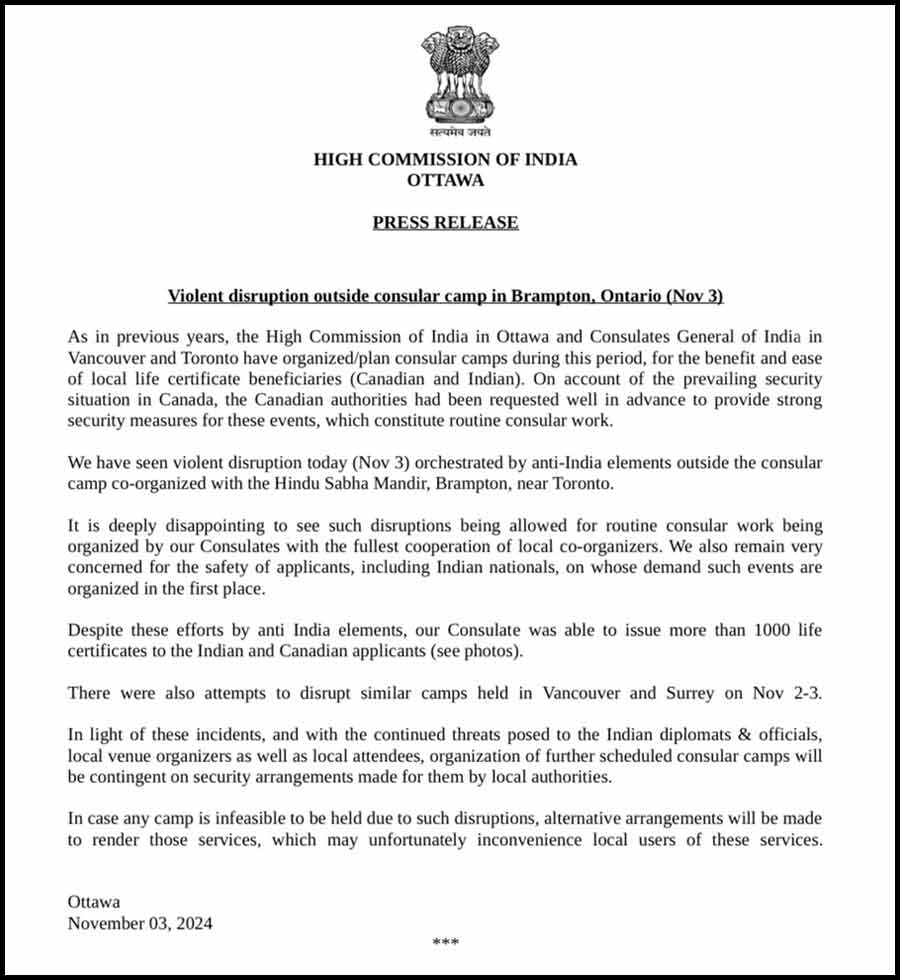 “We have seen violent disruption today (November 3), orchestrated by anti-India elements outside the consular camp co-organised with the Hindu Sabha Mandir in Brampton, near Toronto.” The High Commission said.