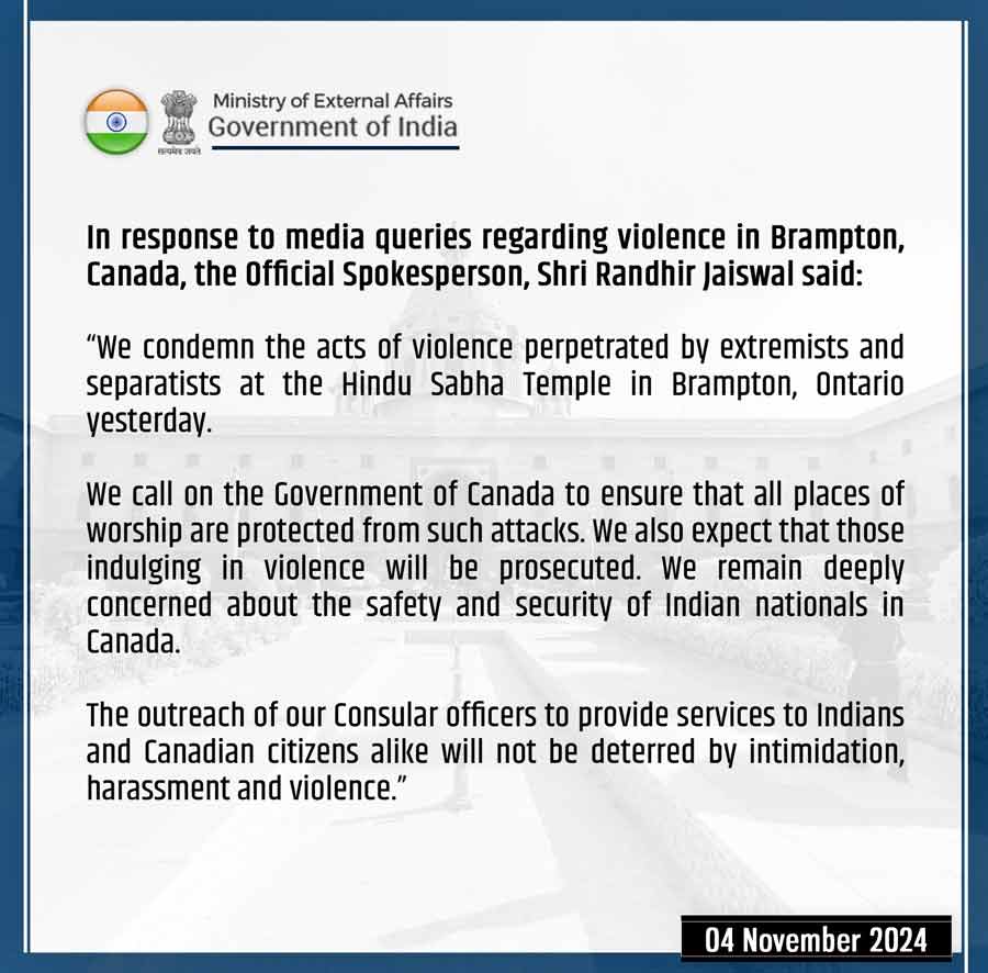 MEA spokesperson Randhir Jaiswal in a statement said, “We condemn the acts of violence perpetrated by extremists and separatists at the Hindu Sabha Temple in Brampton, Ontario yesterday.”