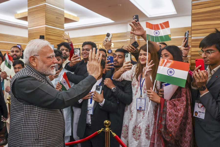 After reaching his hotel, Modi was greeted by the Indian diaspora. Holding the Indian tri-colour, they chanted slogans and sang a cheerful welcome song in Sanskrit.