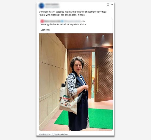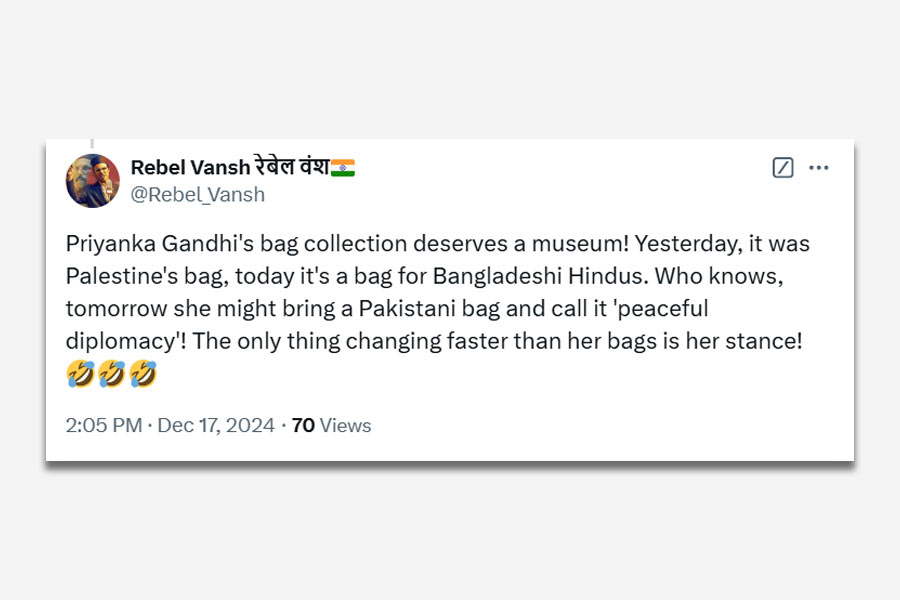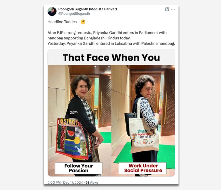 “Priyanka Gandhi’s bag collection deserves a museum! Yesterday, it was Palestine’s bag, today it’s a bag for Bangladeshi Hindus. Who knows, tomorrow she might bring a Pakistani bag and call it ‘peaceful diplomacy’! The only thing changing faster than her bags is her stance!”