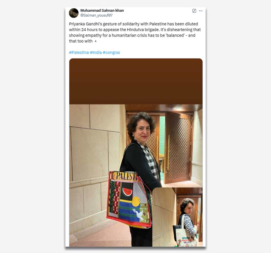 “Priyanka Gandhi’s gesture of solidarity with Palestine has been diluted within 24 hours to appease the Hindutva brigade. It’s disheartening that showing empathy for a humanitarian crisis has to be ‘balanced.’”