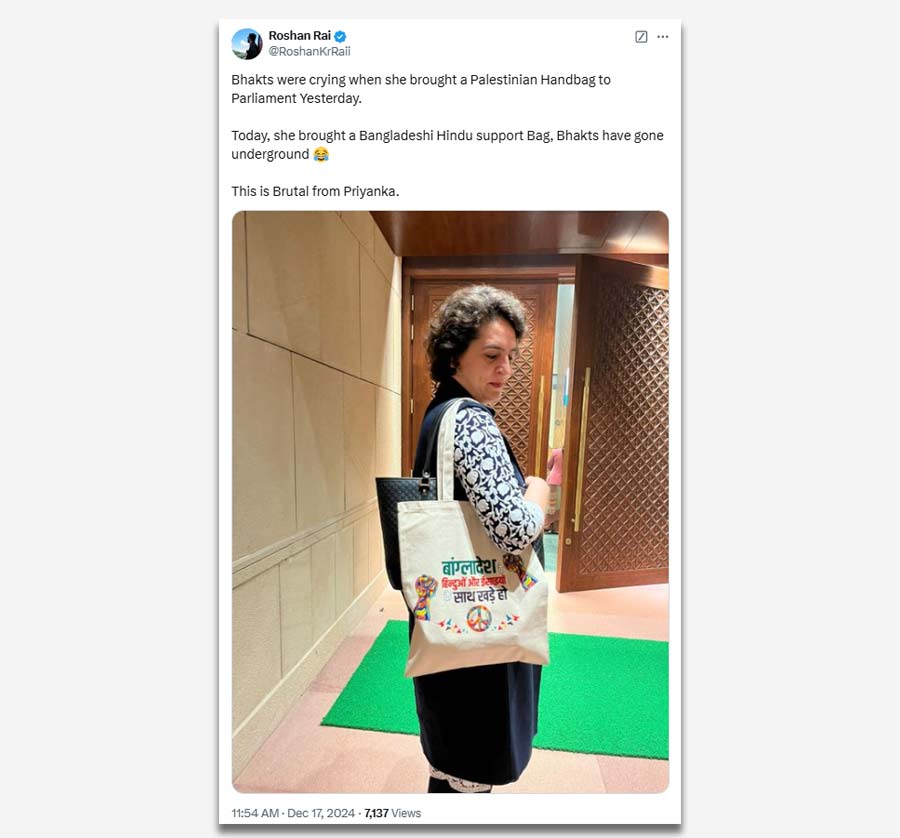 “Bhakts were crying when she brought a Palestinian Handbag to Parliament Yesterday. Today, she brought a Bangladeshi Hindu support Bag, Bhakts have gone underground. This is Brutal from Priyanka.”