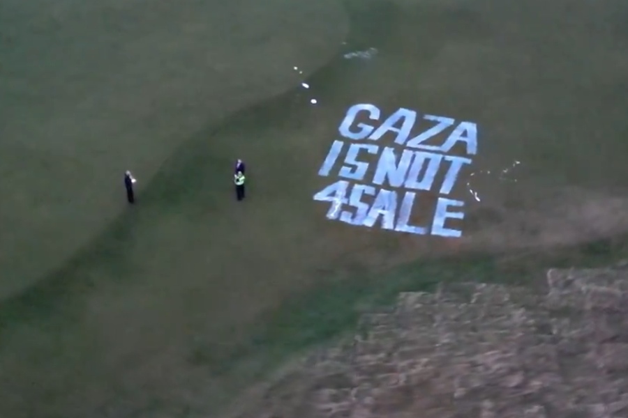 Activists targeted Trump's Turnberry golf course and hotel in southwest Scotland overnight, painting “Gaza Is Not For Sale” in giant letters on the lawn.