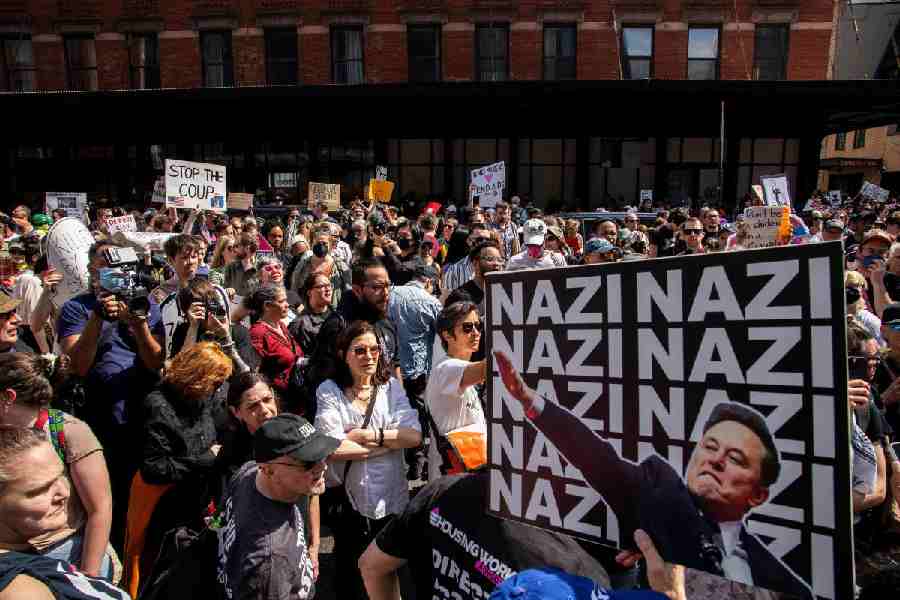 Pictures posted on social media showed protesters brandishing signs such as “Honk if you hate Elon” and “Fight the billionaire broligarchy.”