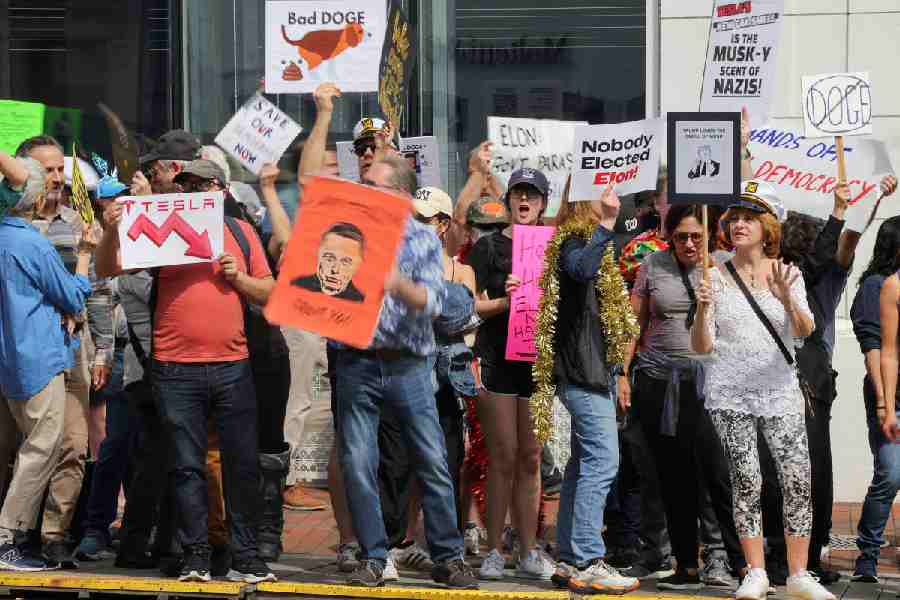 Crowds protesting billionaire Elon Musk's purge of the U.S. government under President Donald Trump began amassing outside Tesla dealerships throughout the US and in some cities in Europe on Saturday in the latest attempt to dent the fortune of the world's richest man.