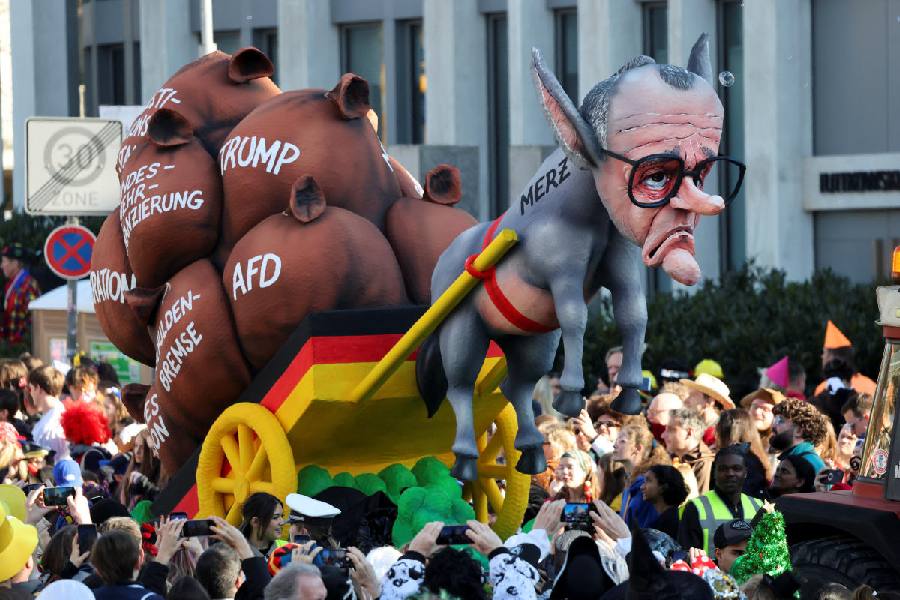 A carnival float by artist Jacques Tilly depicting Christian Democratic Union (CDU) party leader and Chancellor-in-waiting Friedrich Merz, takes part in the traditional "Rosenmontag" Rose Monday carnival parade in Duesseldorf, Germany, March 3, 2025. (Reuters)
