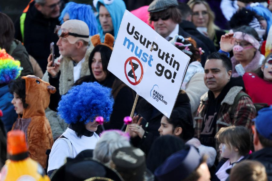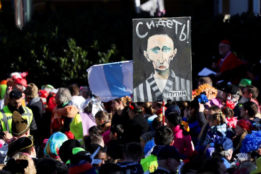 A view shows a placard depicting Russian President Vladimir Putin in jail, on the day of the traditional "Rosenmontag" Rose Monday carnival parade in Duesseldorf, Germany, March 3, 2025. (Reuters)