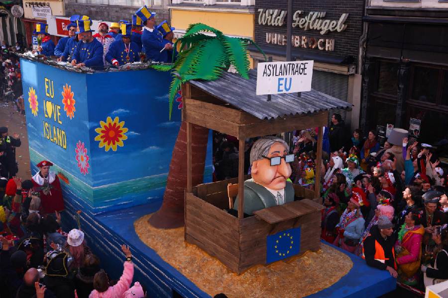 A carnival float, with a sign that reads "EU asylum application", takes part in the traditional "Rosenmontag" Rose Monday carnival parade in Cologne, Germany, March 3, 2025. (Reuters)