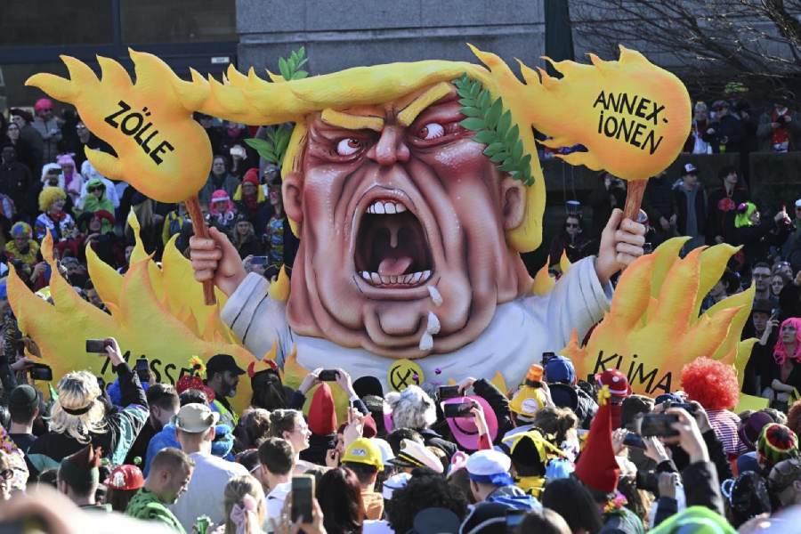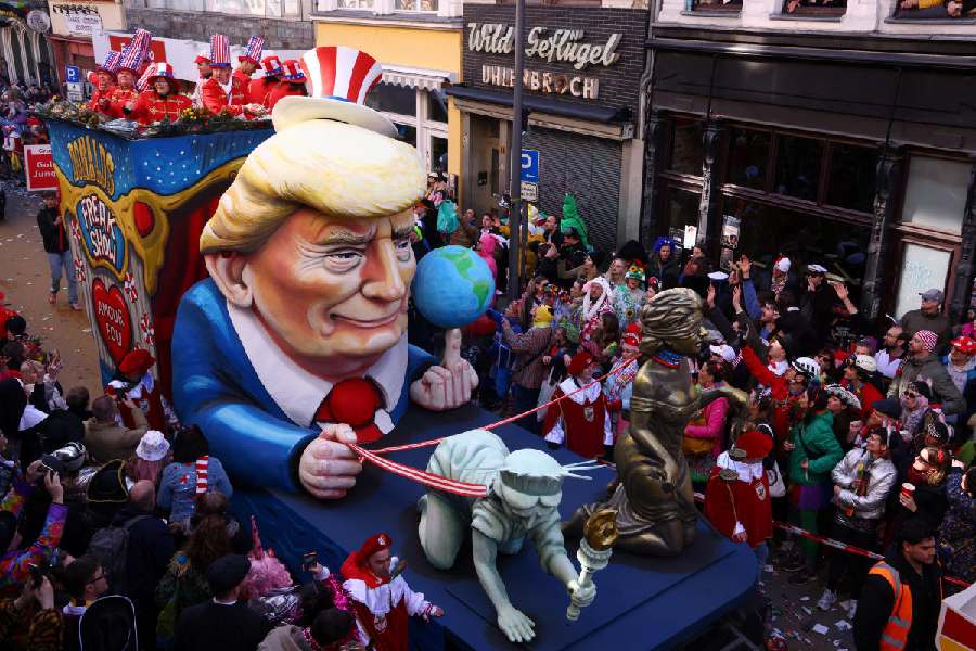 A carnival float despicts US President Donald Trump, surrounded by flames with the words 'Annexations, tariffs, climate destruction, mass deportations' written on them, during the traditional Rose Monday carnival parade in Duesseldorf, Germany, Monday, March 3, 2025. (AP/PTI)