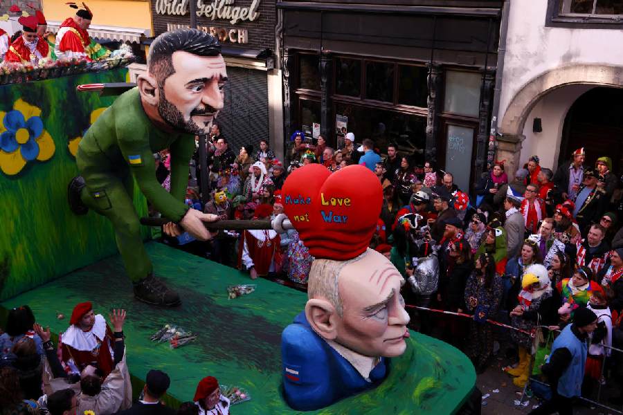 A carnival float by artist Jacques Tilly depicting Russian President Vladimir Putin, Ukrainian President Volodymyr Zelensky and U.S. President Donald Trump takes part in the traditional "Rosenmontag" Rose Monday carnival parade in Duesseldorf, Germany, March 3, 2025. (Reuters)