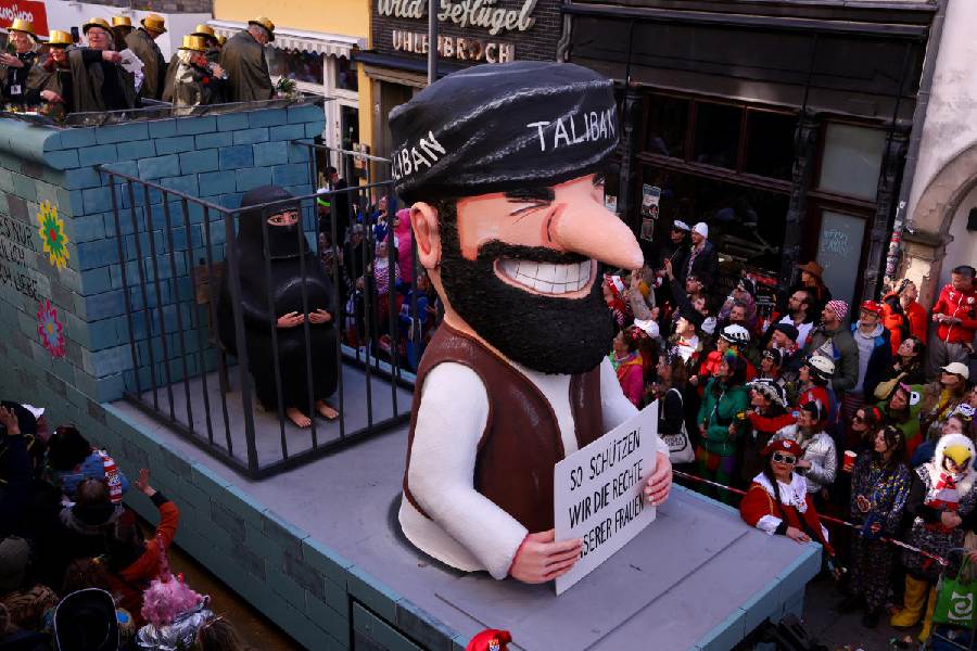 A carnival float, depicting a woman in a cage and a member of the Taliban with a sign that reads "This is how we protect the rights of our women", takes part in the traditional "Rosenmontag" Rose Monday carnival parade in Cologne, Germany, March 3, 2025. (Reuters)