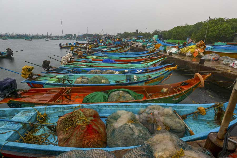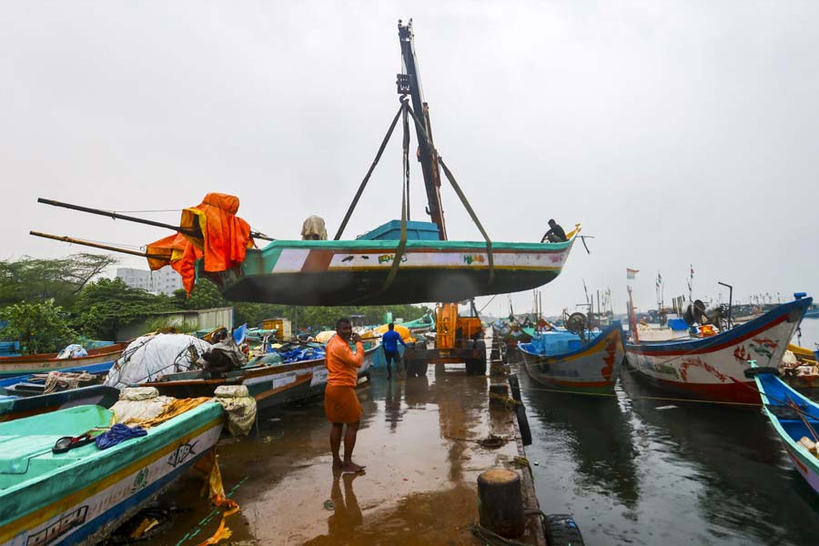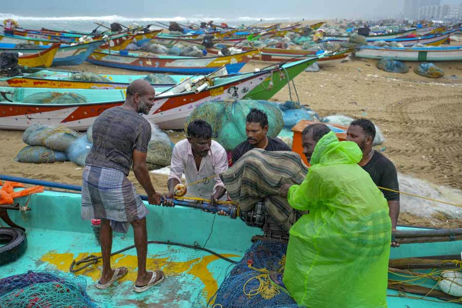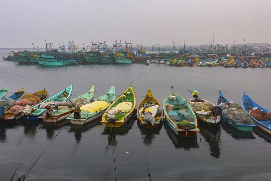 Chennai: Fishing boats anchored amidst the forecast of heavy rains at Marina beach, along the coast of the Bay of Bengal, in Chennai, Tuesday, Nov. 26, 2024