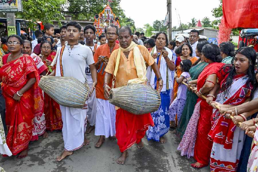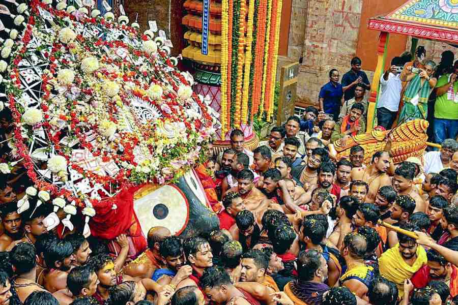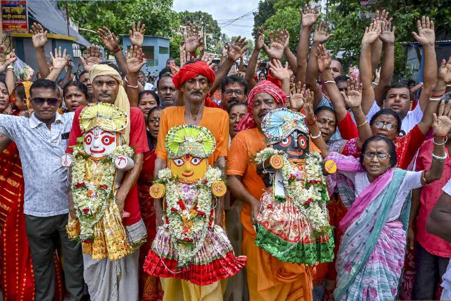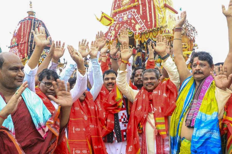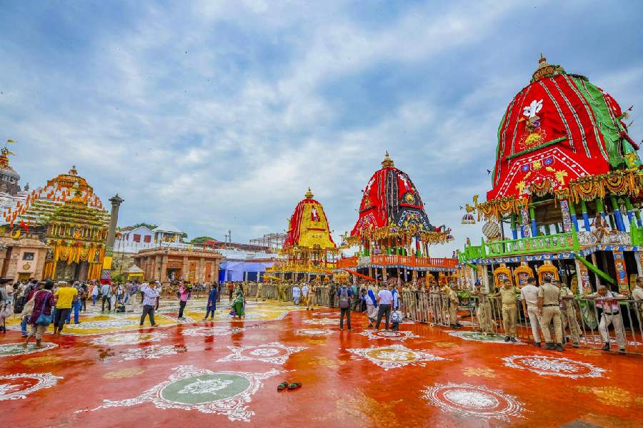 The 'Pahandi' ritual in which Lord Balabhadra, Devi Subhadra and Lord Jagannath are being carried in a procession from the 12th-century temple to their respective chariots for the Rath Yatra started on Friday.