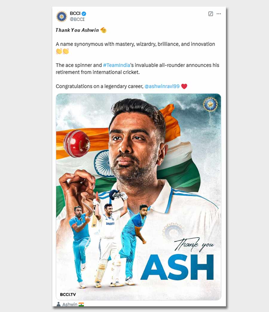 The BCCI congratulated Ashwin on a special career.