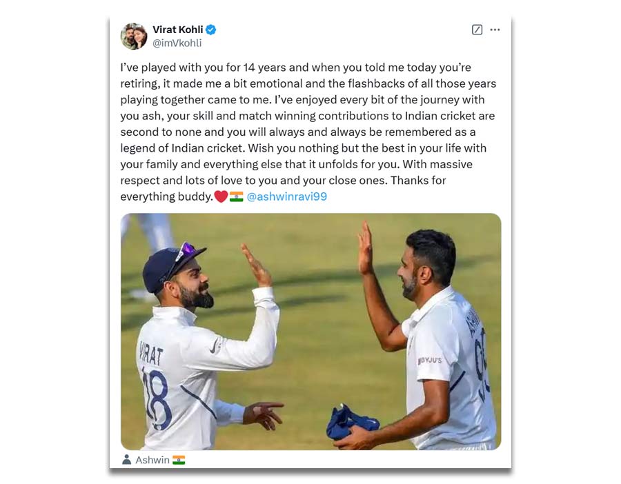 Virat Kohli wrote on X, "I’ve had the privilege of playing alongside you for 14 years, and hearing today that you're retiring brought back a flood of memories. Reflecting on all those years we spent playing together, I’ve cherished every moment. Your skill and match-winning contributions to Indian cricket are unmatched, and you will always be remembered as a legend of the game."