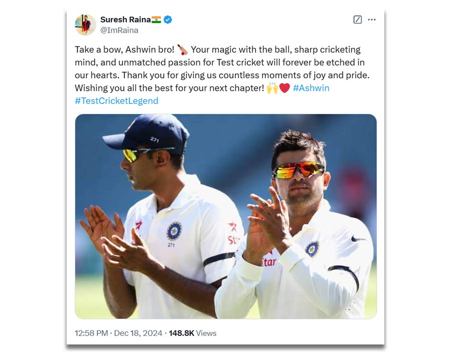 Suresh Raina paid a tribute to his Indian and CSK teammate and wrote on X, "Take a bow, Ashwin! Your magic with the ball, sharp cricketing mind, and unmatched passion for Test cricket will forever be etched in our hearts. Thank you for giving us countless moments of joy and pride. Wishing you all the best for your next chapter!"