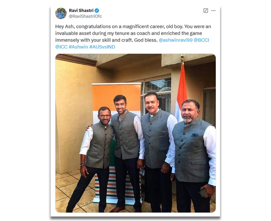 Ravi Shastri, former coach of the Indian cricket team, said, "Congratulations on a magnificent career, old boy. You were an invaluable asset during my tenure as coach and enriched the game immensely with your skill and craft. God bless."