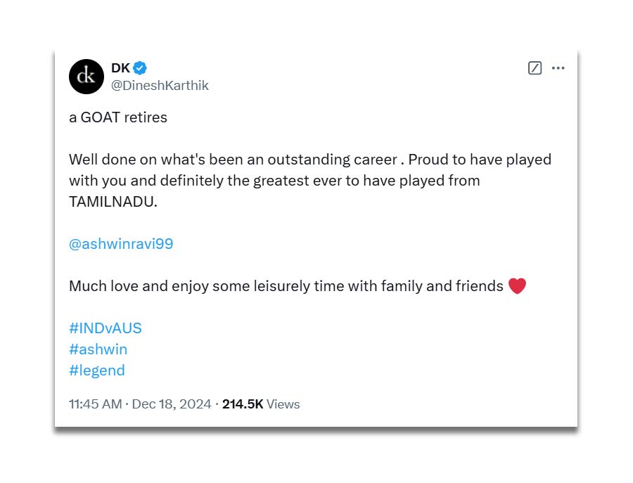 Dinesh Karthik said Ashwin was the greatest cricketer to have come from Tamil Nadu. In his post on X, Karthik expressed pride in having played alongside him, saying, "Well done on what's been an outstanding career. Proud to have played with you and definitely the greatest ever to have played from Tamil Nadu. Much love and enjoy some leisurely time with family and friends."