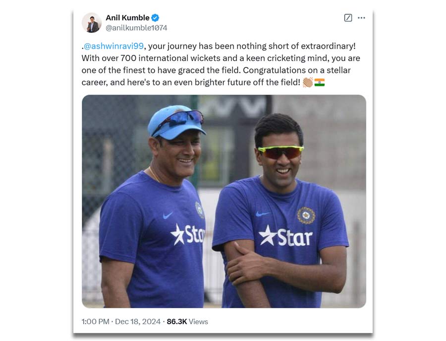 "Your journey has been nothing short of extraordinary! With over 700 international wickets and a keen cricketing mind, you are one of the finest to have graced the field. Congratulations on a stellar career, and here's to an even brighter future off the field!" wrote Kumble.