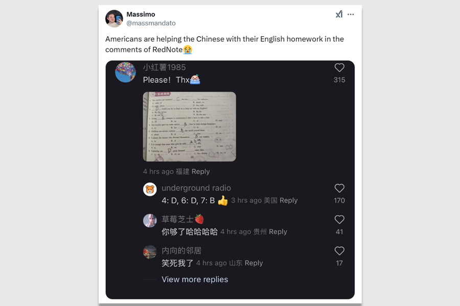 Other users shared amusing stories of Chinese users on RedNote asking Americans for help with their English homework.