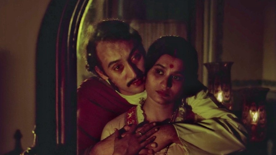 Ray's Ghare-Baire is adapted from Tagore's novel by the same title. The story follows a love triangle in the backdrop of Swadeshi movement. Bimala, wife of a zamindar Nikhilesh falls in love with a Swadeshi leader. Satyajit Ray portrayed Bimala as a timid women who found herself better after discovering the world outside of her domestic life. Her self-discovery was encouraged by her husband. In the end, she ultimately returned to Nikhilesh.