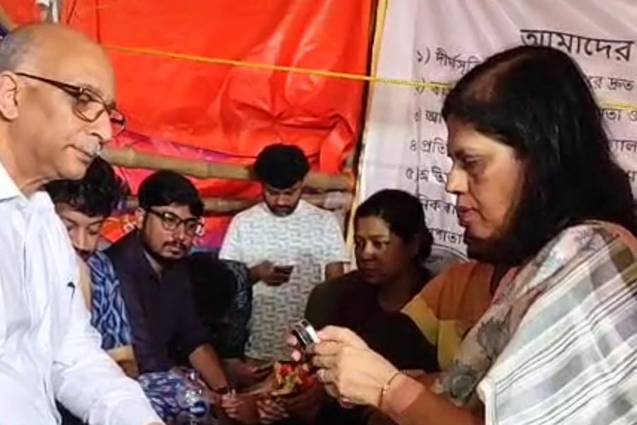 Also present were home secretary Nandini Chakravarty and deputy commissioner of police (central) Indira Mukhopadhyay, some members of the civil society who have joined the hunger strike in solidarity, members of the media, and onlookers in the heart of Calcutta in the midst of the festive season.