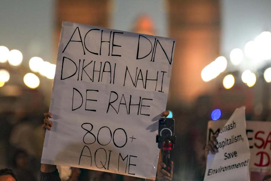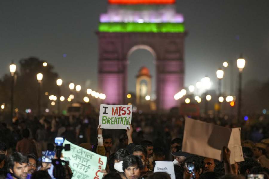 Scores of people, including children, staged a protest near India Gate on Sunday, holding placards like "Smog se Azadi!" and "Breathing is killing me" as Delhi's air quality index (AQI) touched 370 in the "very poor" category.