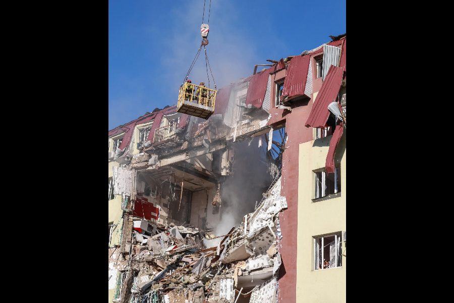 Rescuers work at a site an apartment building hit by a Russian drone strike, amid Russia's attack on Ukraine, in Odesa, Ukraine April 6, 2026.