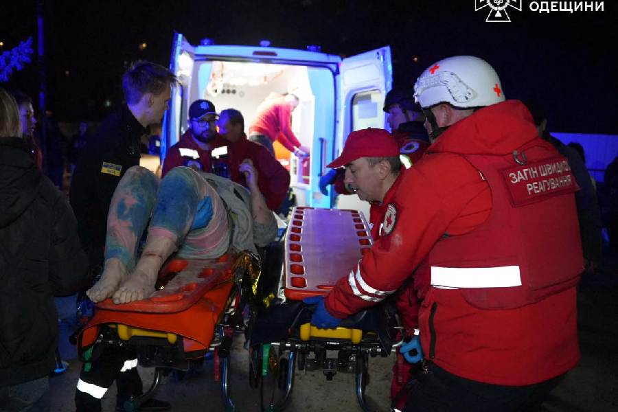Medical workers stand near a wounded resident from the apartment building hit by a Russian drone strike, amid Russia's attack on Ukraine, in Odesa, Ukraine.