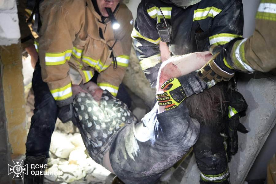 Rescuers evacuate a resident from the apartment building hit by a Russian drone strike, amid Russia's attack on Ukraine, in Odesa, Ukraine in this handout picture released April 6, 2026.