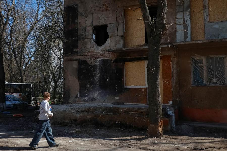 A boy walks past an apartment building hit by a Russian drone strike, amid Russia's attack on Ukraine, in Odesa, Ukraine April 5, 2026.