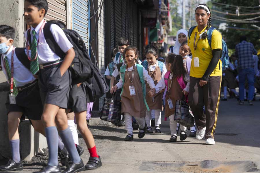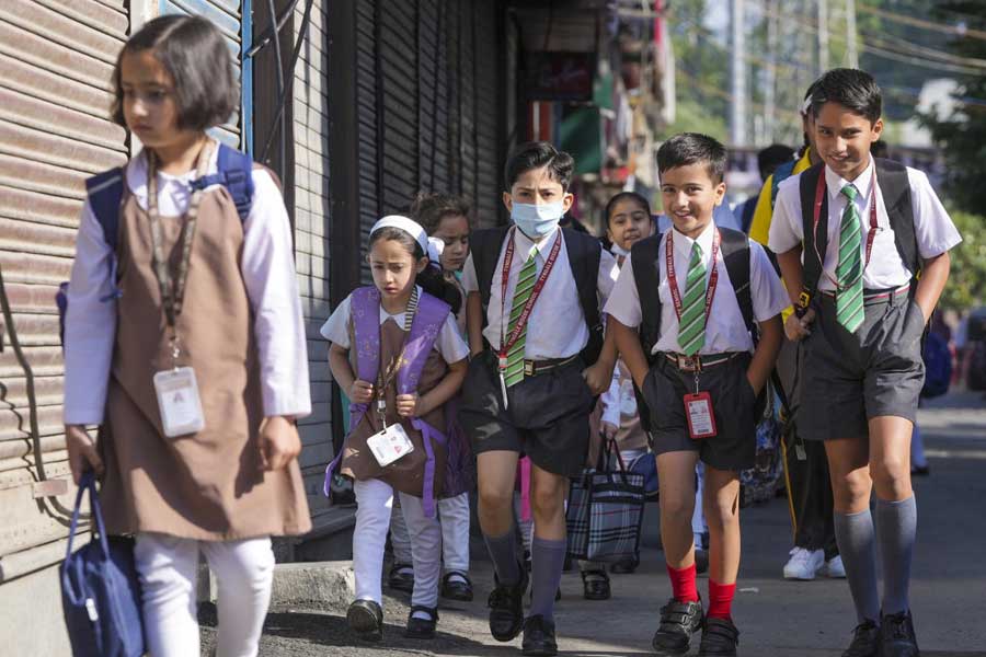 Students arrive at a school as educational institutions reopen in non-border districts of Jammu and Kashmir.