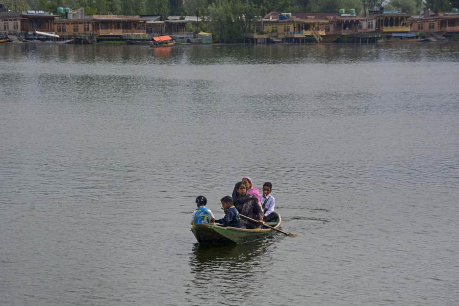 Students along with their guardians head to their school on a boat as educational institutions reopened in non-border districts of Jammu and Kashmir.