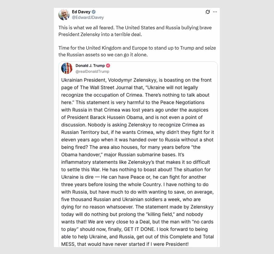 "This is what we all feared. The United States and Russia bullied brave President Zelensky into a terrible deal. Time for the United Kingdom and Europe to stand up to Trump and seize the Russian assets so we can go it alone," said British politician and Leader of the Liberal Democrats Ed Davey.