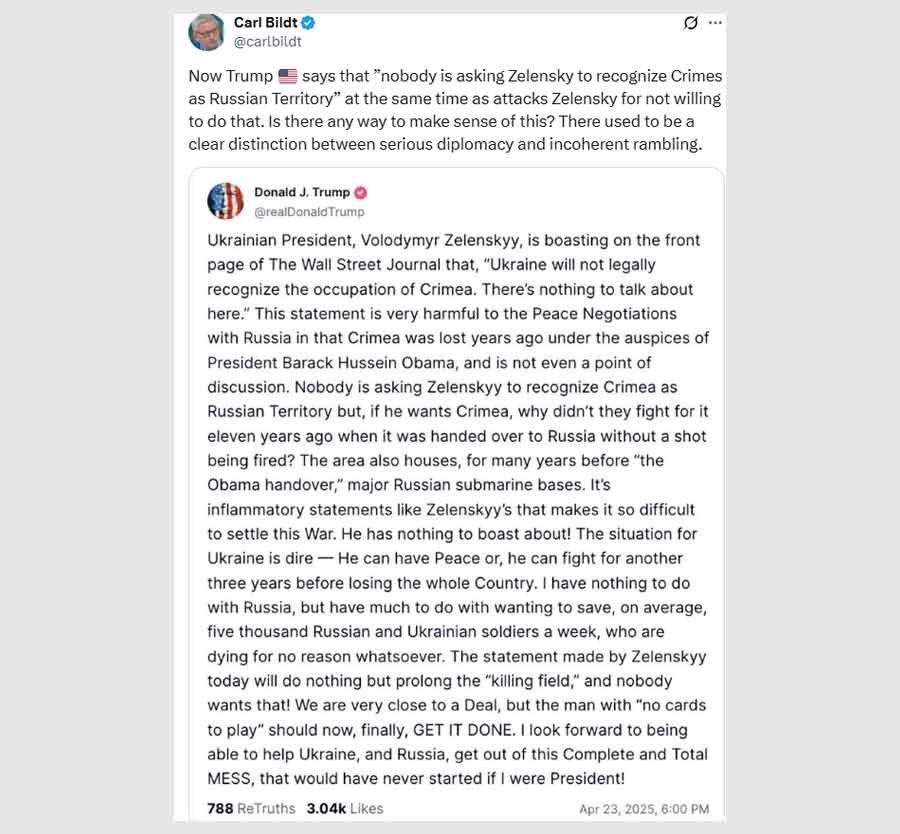 "Now Trump says that 'nobody is asking Zelensky to recognize Crimea as Russian Territory' at the same time as attacking Zelensky for not willing to do that. Is there any way to make sense of this? There used to be a clear distinction between serious diplomacy and incoherent rambling," said Carl Bildt.