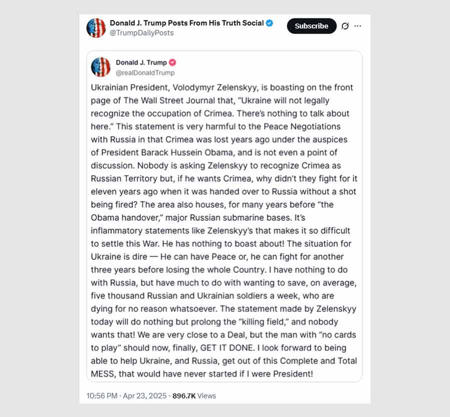 “This statement is very harmful to the peace negotiations with Russia,” Trump posted on Truth Social, adding that Crimea was “lost years ago and is not even a point of discussion.”