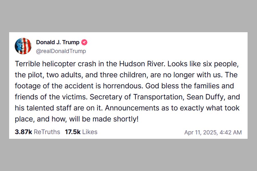 “Terrible helicopter crash in the Hudson River. Looks like six people, the pilot, two adults, and three children, are no longer with us. The footage of the accident is horrendous. God bless the families and friends of the victims. Secretary of Transportation, Sean Duffy, and his talented staff are on it. Announcements as to exactly what took place, and how, will be made shortly!” he said.
